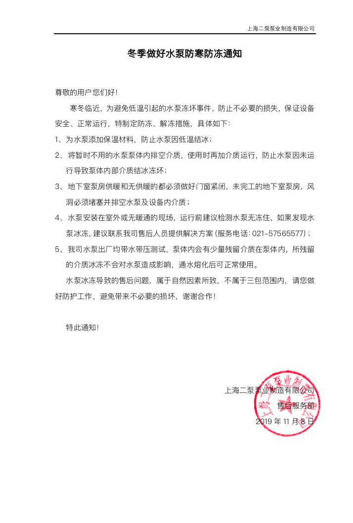 冬季做好水泵防寒防凍通知-上海二泵